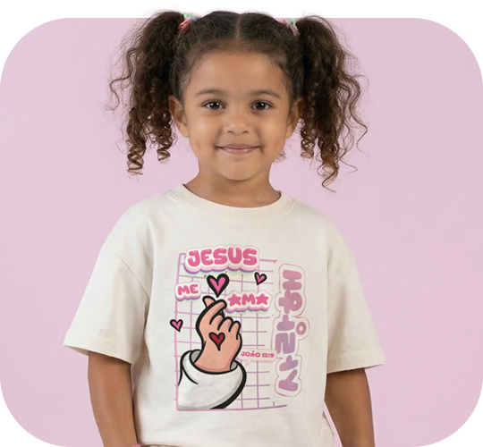 Mais do que vestir, esta camiseta convida as crianças a lembrarem todos os dias de uma verdade simples e poderosa: Jesus nos ama.