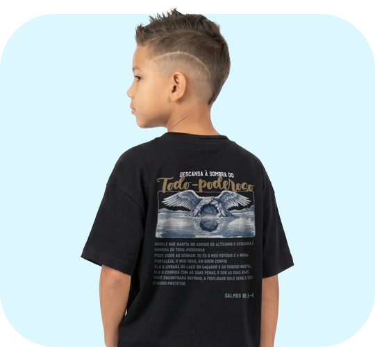 Essa é a declaração que nossa Camiseta Infantil Oversized Salmo 91 exibe em cada detalhe das estampas.