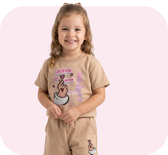 Mais do que vestir, este conjunto convida as crianças a lembrarem todos os dias de uma verdade simples e poderosa: Jesus nos ama.